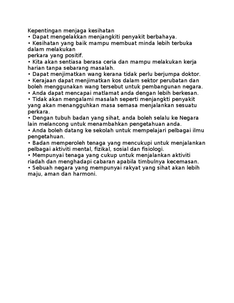 Alam sekitar memainkan peranan penting dalam kehidupan harian kitaAlam sekitar yang tidak tercemar memberikan kita satu suasana yang selesa dan menyamankanDi samping itu ia memberi keselesaan kepada manusiaia juga sedikit sebanyak akan menjejeskan aktiviti-aktiviti pembangunan negara sekiranya alam sekitar tidak. Melalui pemeriksaan kesihatan sekurang-kurangnya enam bulan sekali pihak doktor mampu mengesan sebarang simpton awal penyakit yang boleh mengancam nyawa manusia pula. Penyakit jantung koronari CHD termasuk serangan jantung terganggu bekalan darah ke jantung disebabkan oleh salur darah tersumbat dan angina sakit dada sementara.
